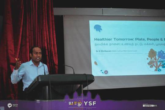 A YSF forum was held on June 24, 2023, at Hoover Auditorium, Faculty of Medicine, Jaffna. The forum was titled "Healthier Tomorrow: Plate, People, and Planet" and was delivered by Dr. K. Shribavan, Co-founder of Suvadi.